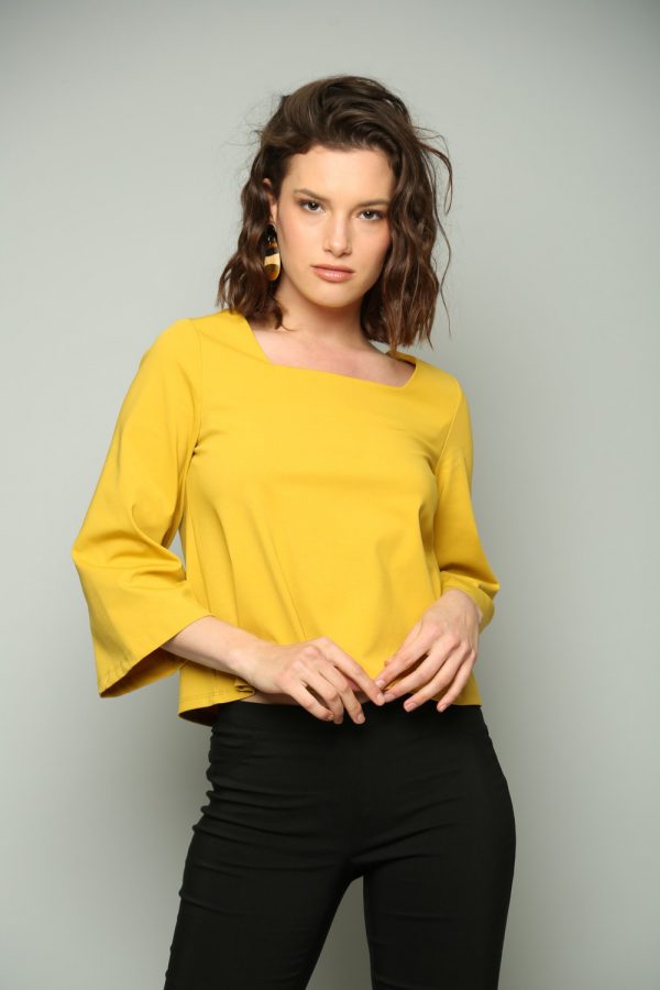 חולצת פסים אופ-שולדר בגוני תכלת ולבן, עם שרוולים באורך המרפק בעלי קשירה ייחודית, וגזרה קייצית ורעננה.